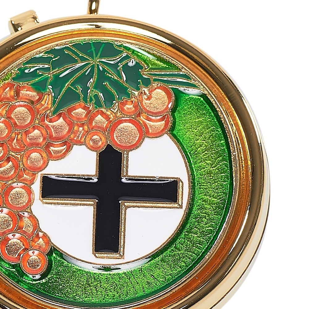 Teca eucaristica porta ostie, diametro 5,4 cm. Completa di anello per poterla appendere al collo. Realizzata in ottone e smaltata raffigurant grappoli d'uva e croce.