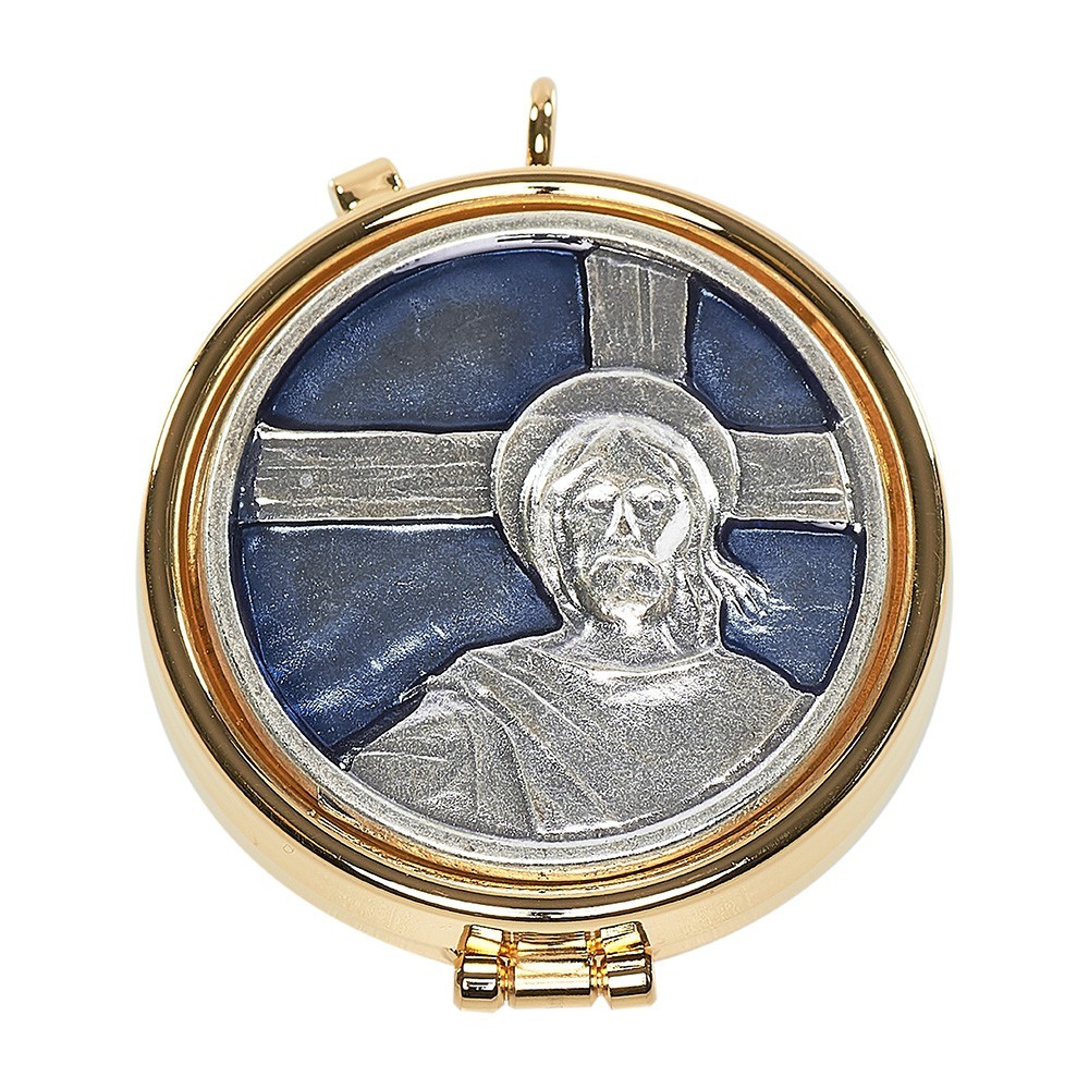 Teca porta ostie "Ecce Homo", realizzata in ottone e smaltata sul coperchio. Viene fornita completa di anello per poterla appendere al collo.