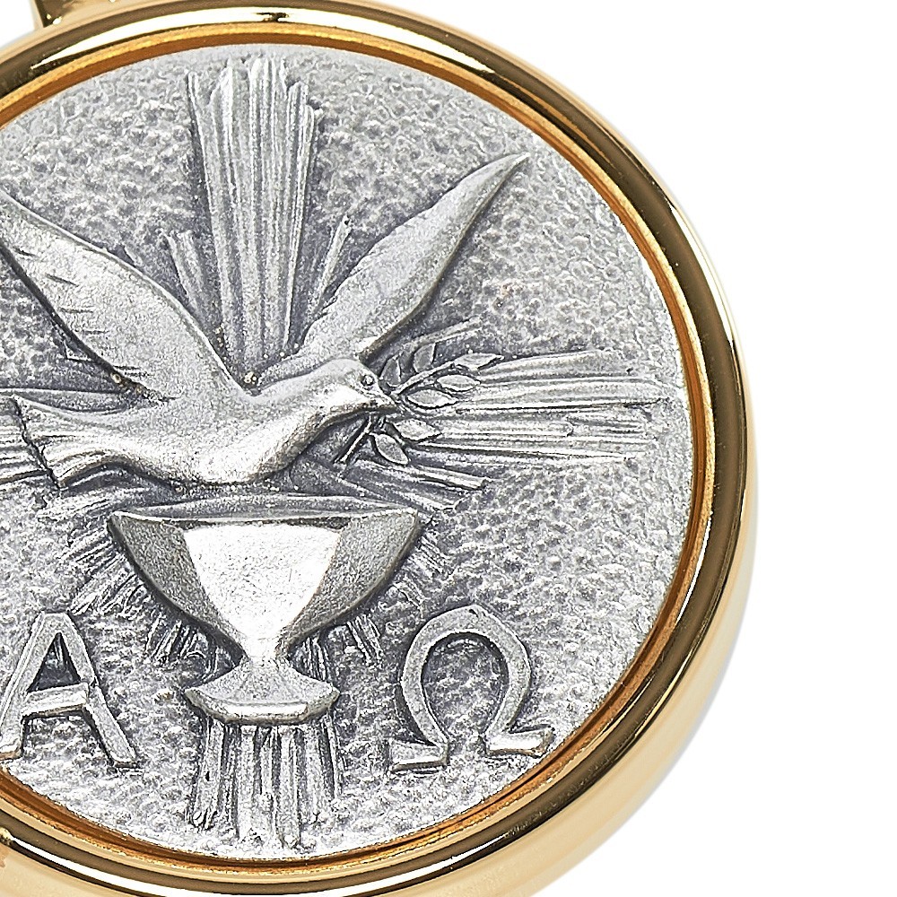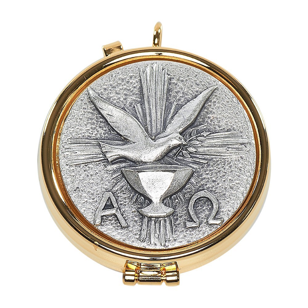 Teca per ostie realizzata in ottone dorato con placca in peltro. Sul coperchio vi è riportata in rilievo l'immagine di una colomba e i simboli Alfa e Omega.