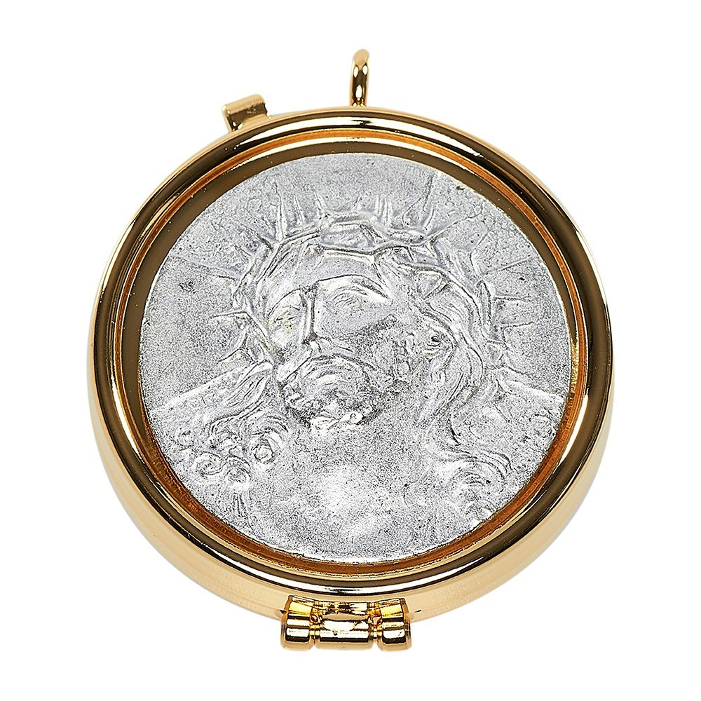 Teca per ostie realizzata in metallo dorato e placca in peltro raffigurante l'immagine in rilievo di Gesù Cristo coronato di spine. Chiusura ad incastro.