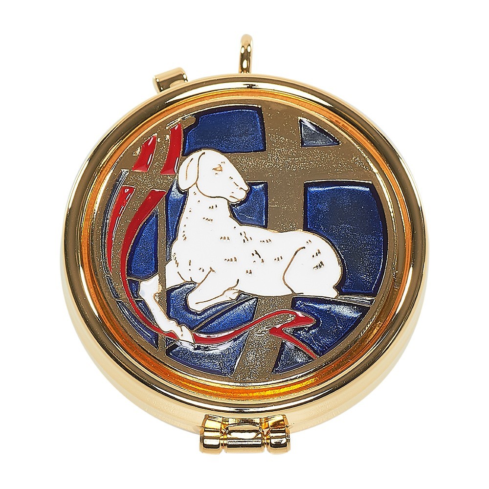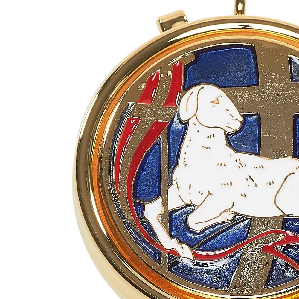 Teca Eucaristica per ostie realizzata in ottone con placca smaltata. Sulla placca vi è raffigurato in rilievo l'agnello. La teca è viene fornita completa di anello per poterla appendere al collo.