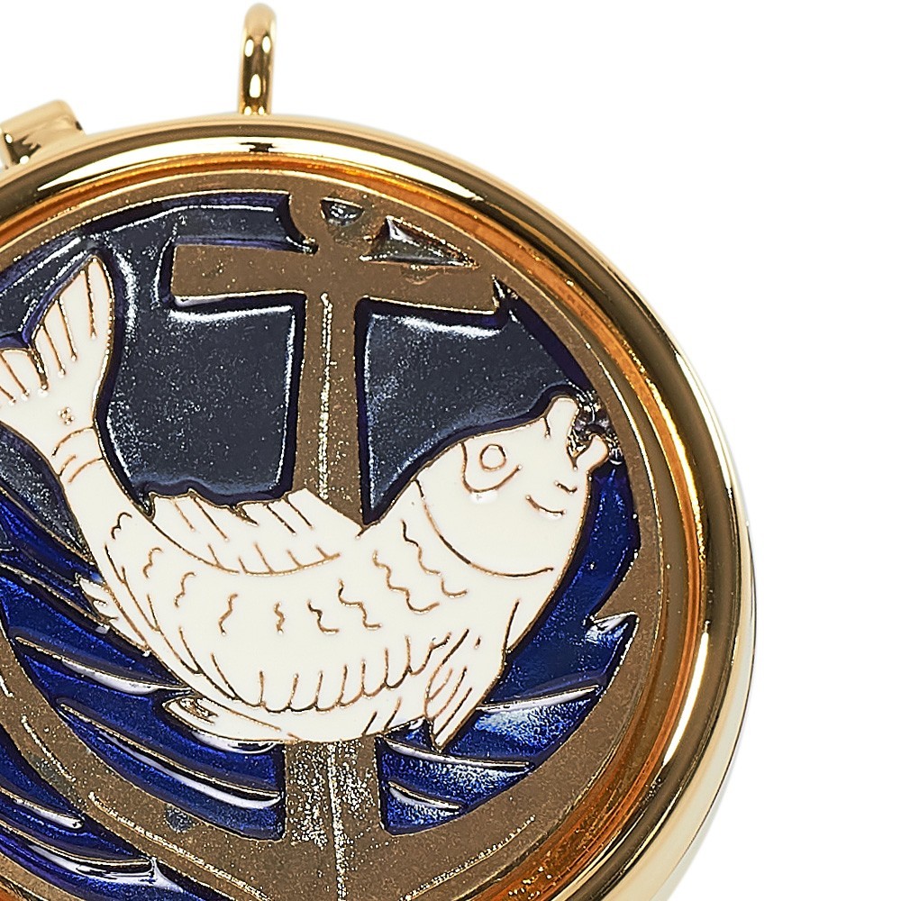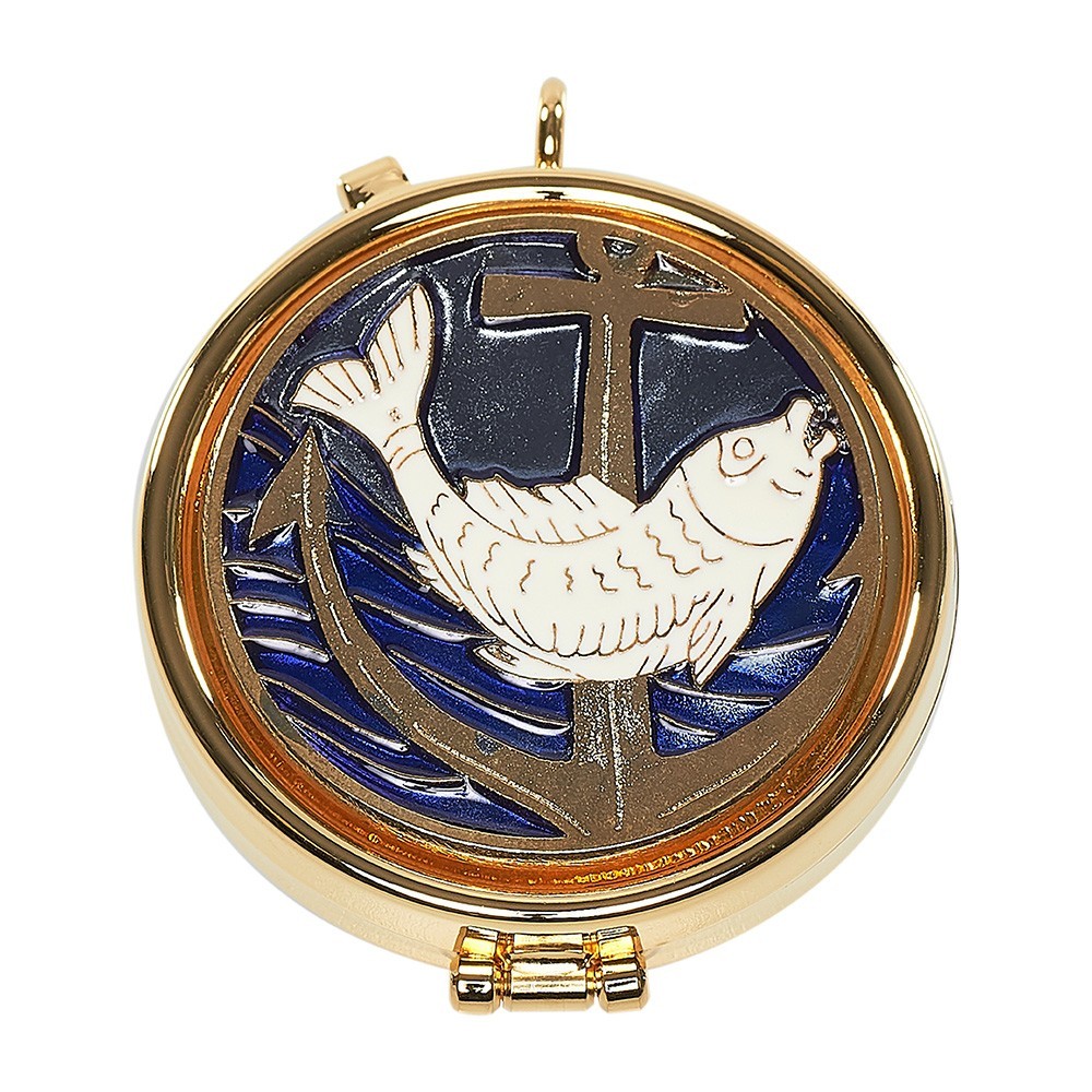 Teca portaostie (diametro 5,4 cm) realizzata in metallo dorato con placca smaltata. Sulla placca vi è raffigurata un'ancora con un pesce.