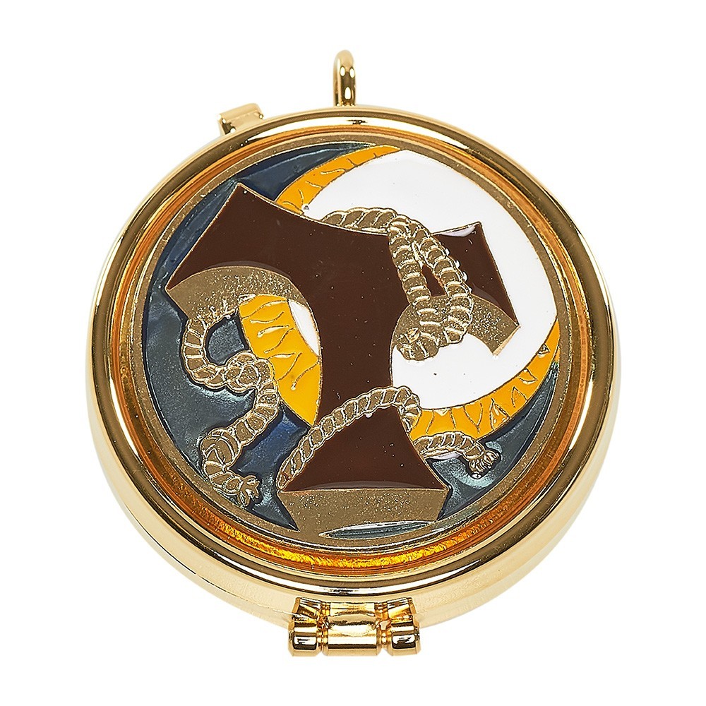 Questa teca poortaostie è interamente in metallo dorato con placca sul coperchio smaltata. Sulla placchetta vi è raffigurato in rilievo il Tau francescano. I coloti utilizzati rendono il prodotto di grande impatto. Completa di anello per catenella da appendere.