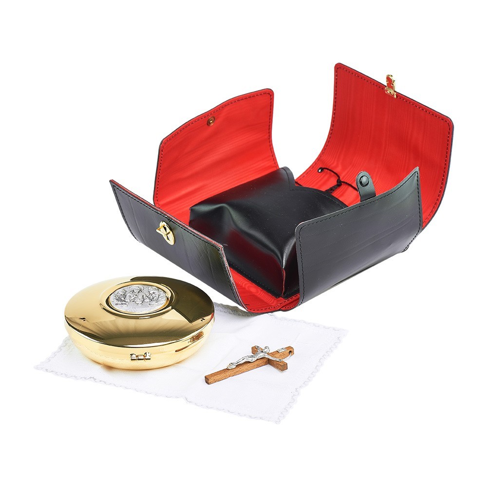 Consegna in 2 settimaneTeca porta ostie in ottone con Sacra Famiglia incisa su placca in bronzo.