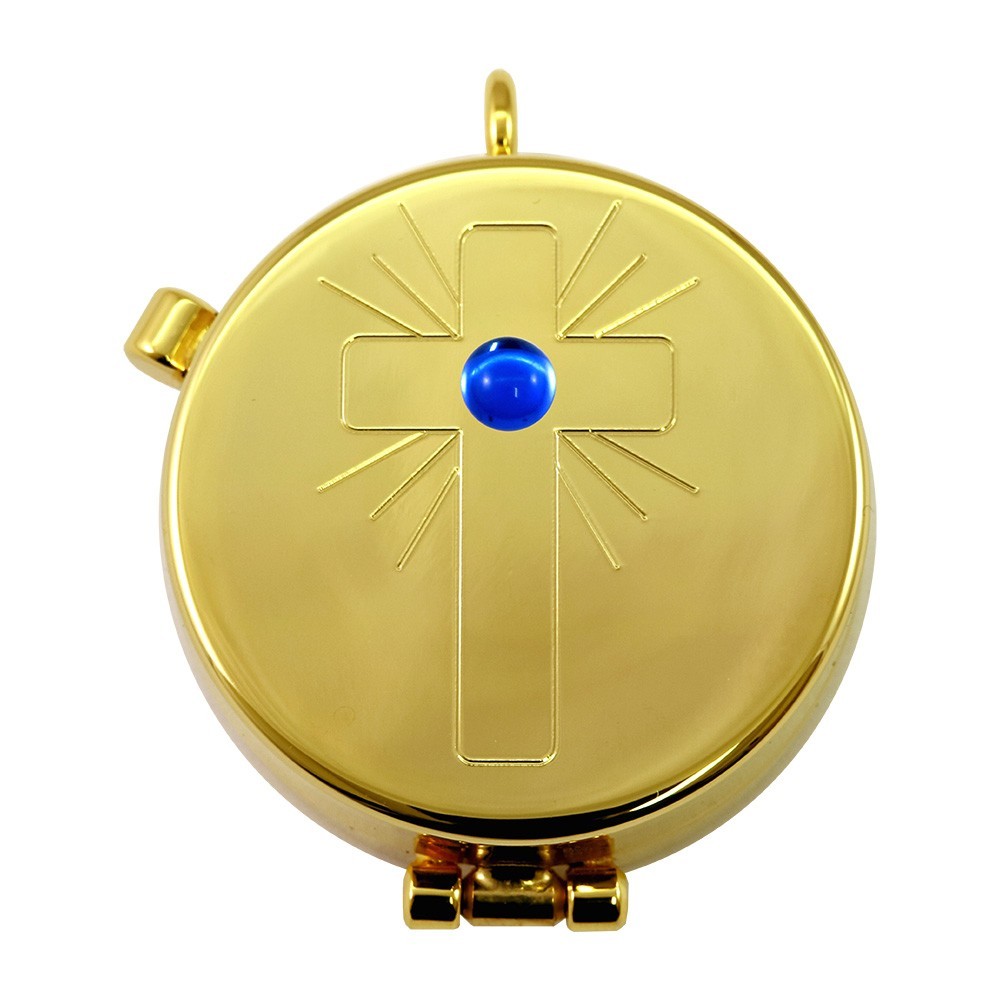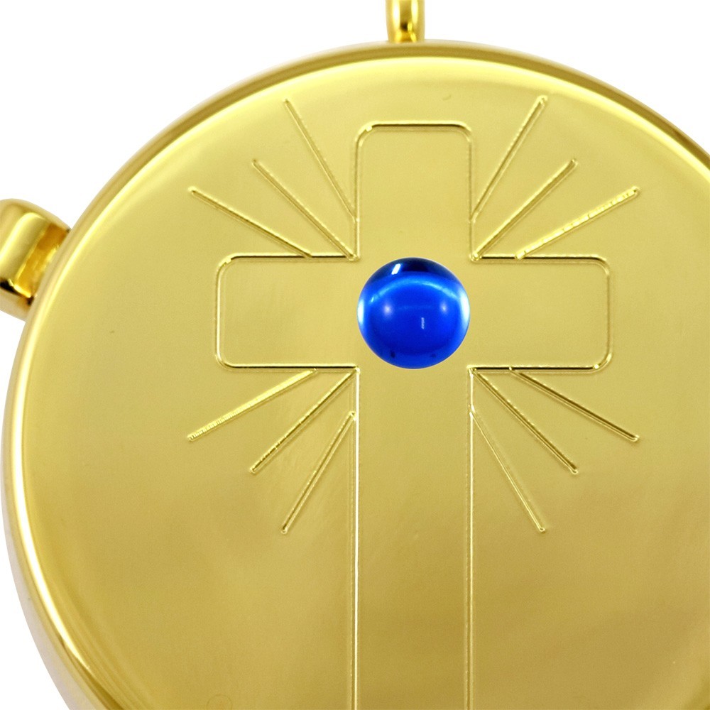 Piccola teca per ostie con croce incisa e pietra blu.