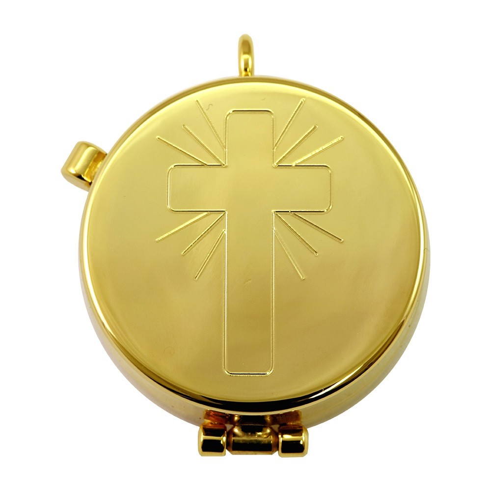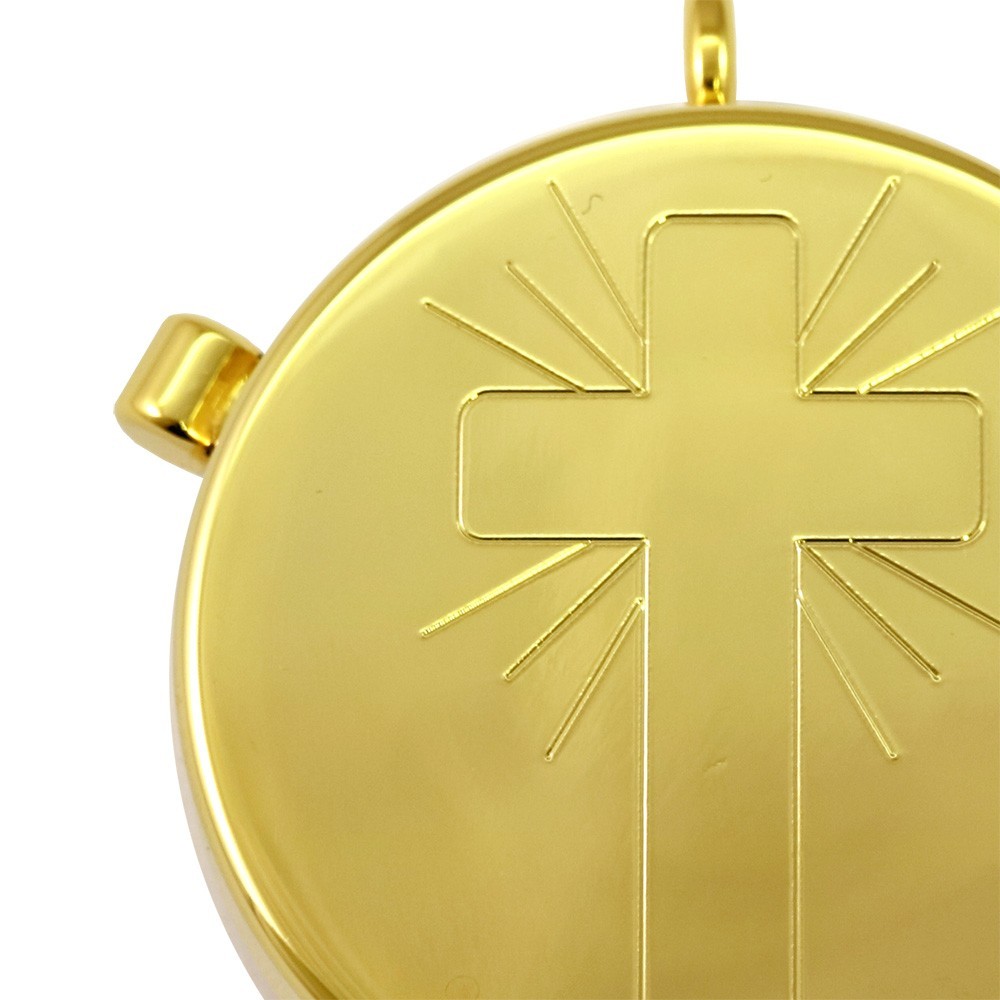 Mini teca eucaristica porta ostie in ottone con croce incisa e pietra colorata.