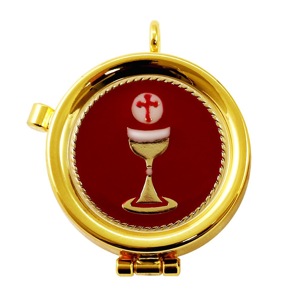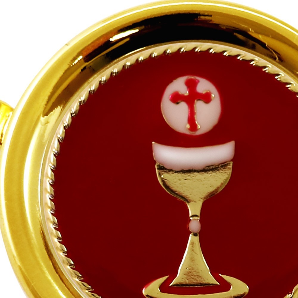 Teca portaostie mini di diametro 4 cm realizzata in ottone dorata e con placca smaltata con decoro calice e ostia su fondo rosso. La teca è alta 1,5 cm ca.