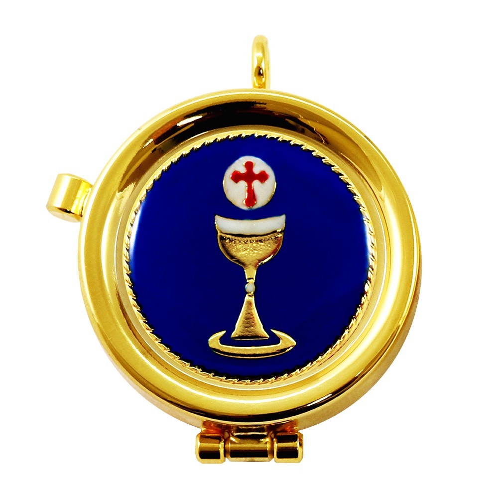 Teca Eucaristica portaostie mini di diametro 4 cm realizzata in ottone dorata e con placca smaltata con decoro calice e ostia su fondo blu.