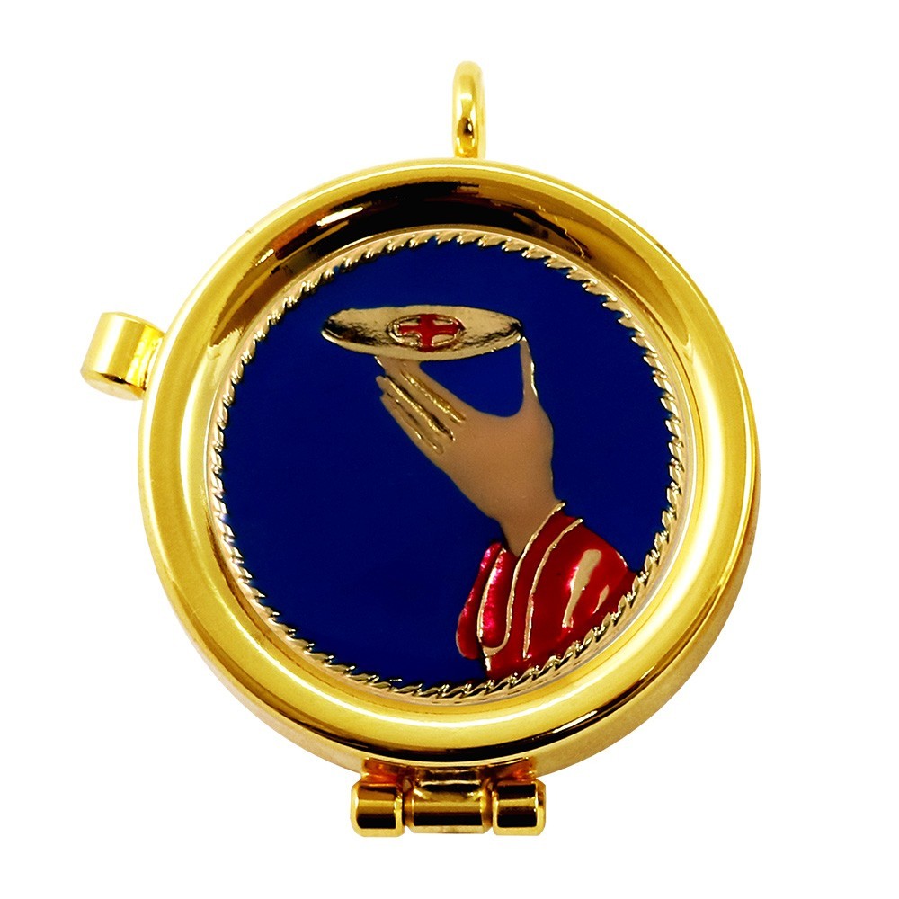 Piccola teca porta ostie di diametro 4 cm con placca smaltata Comunione.