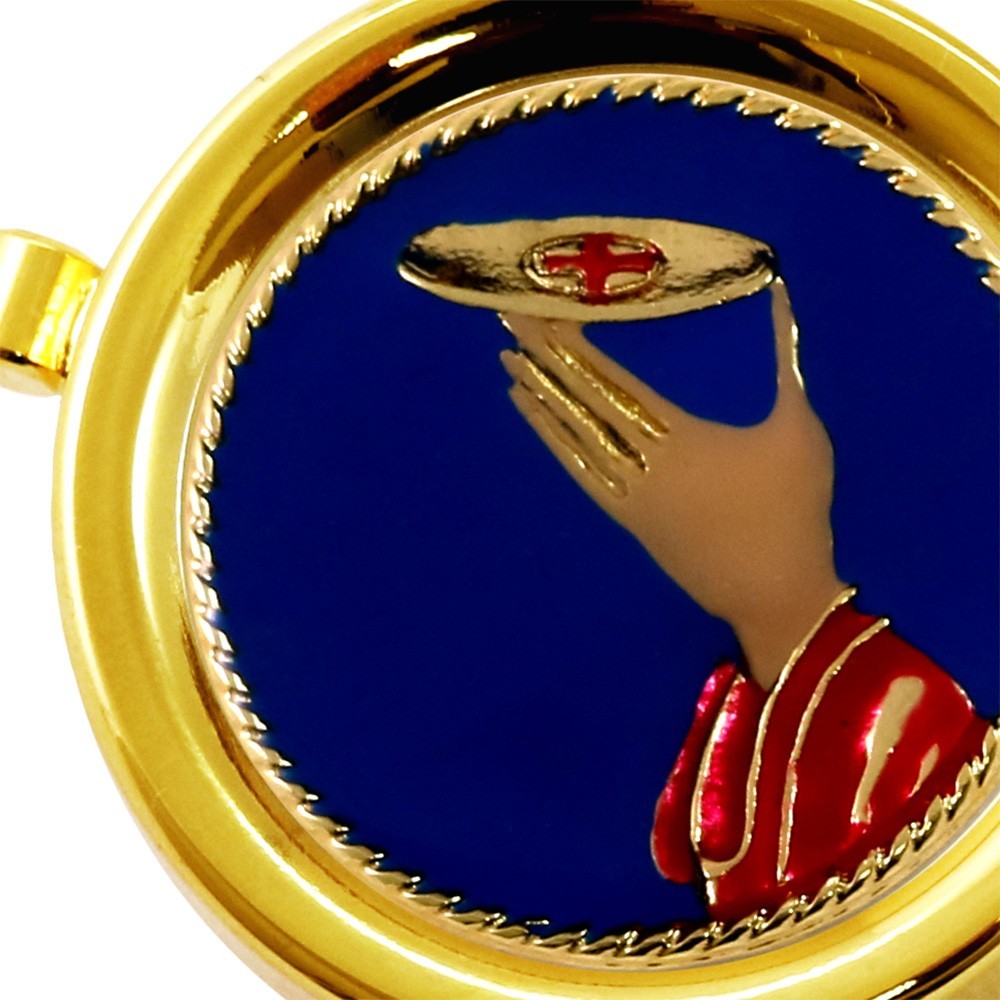 Teca eucaristica per ostie in ottone smaltata con decoro calice su fondo blu.
