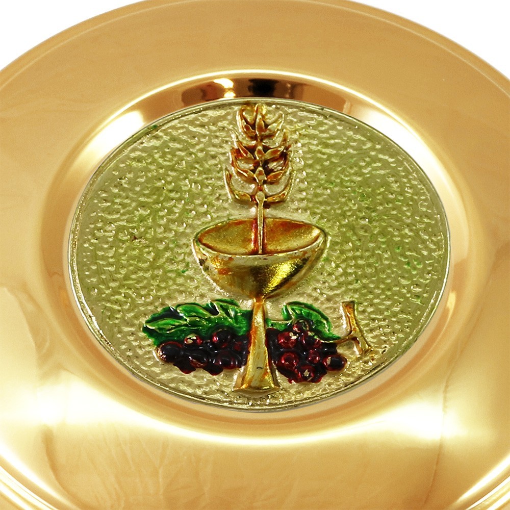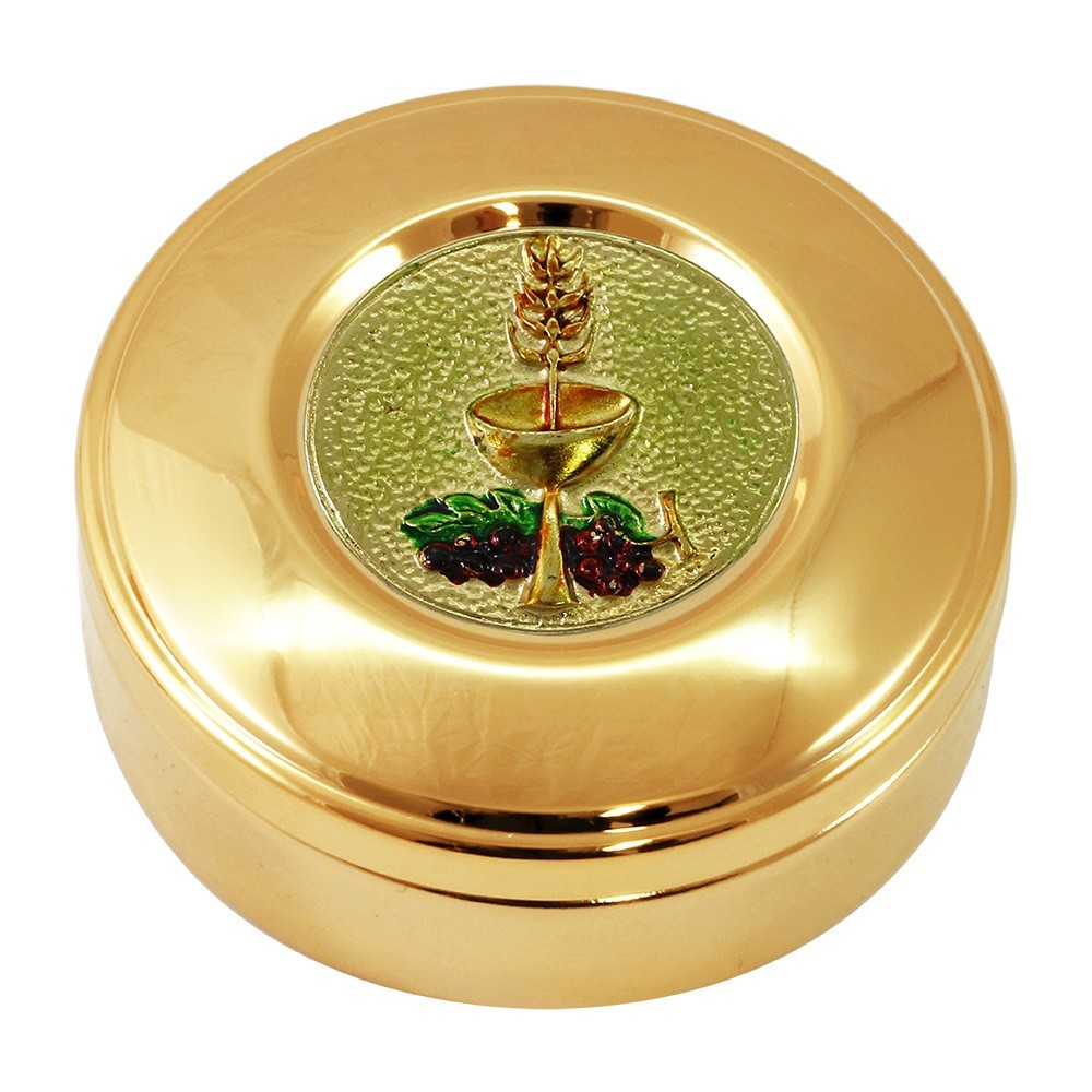 Questa teca porta ostie si presenta con placca smaltata e decorata con Calice. La teca è realizzata in ottone dorata, con diametro 8,4 cm. L'altezza della teca 2,5 cm. Produzione italiana.