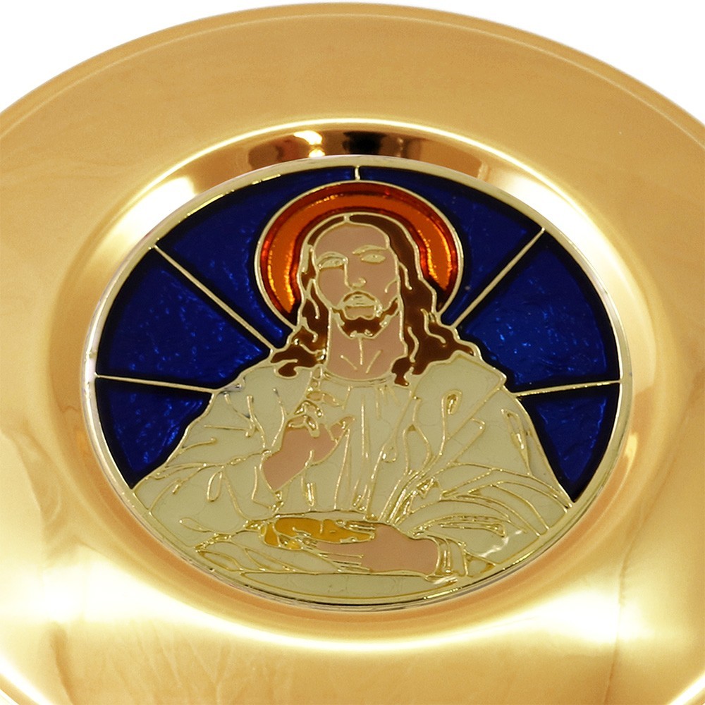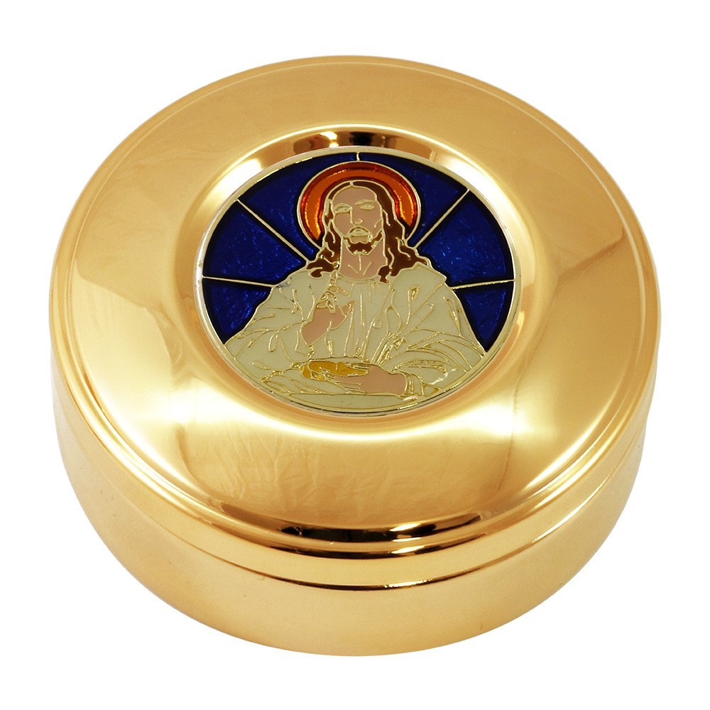 Questa teca eucaristica per ostie si presenta con placca smaltata con sfondo blu e immagine di Gesù Cristo. La teca è realizzata in ottone dorata, con diametro 8,4 cm. L'altezza della teca 2,5 cm.