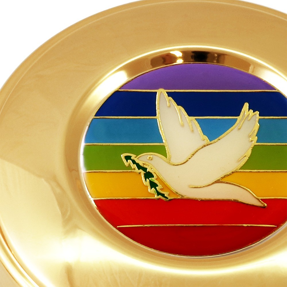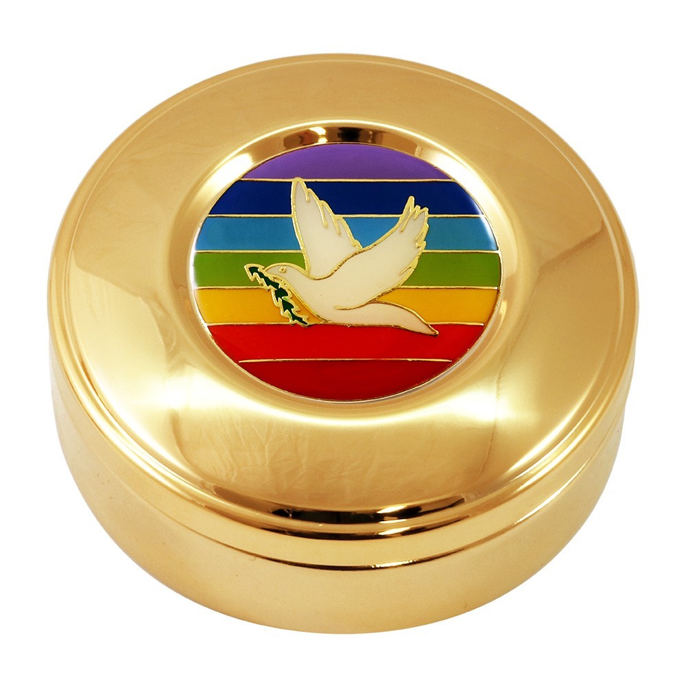 Teca porta ostie in ottone con placca smaltata Spirito Santo.