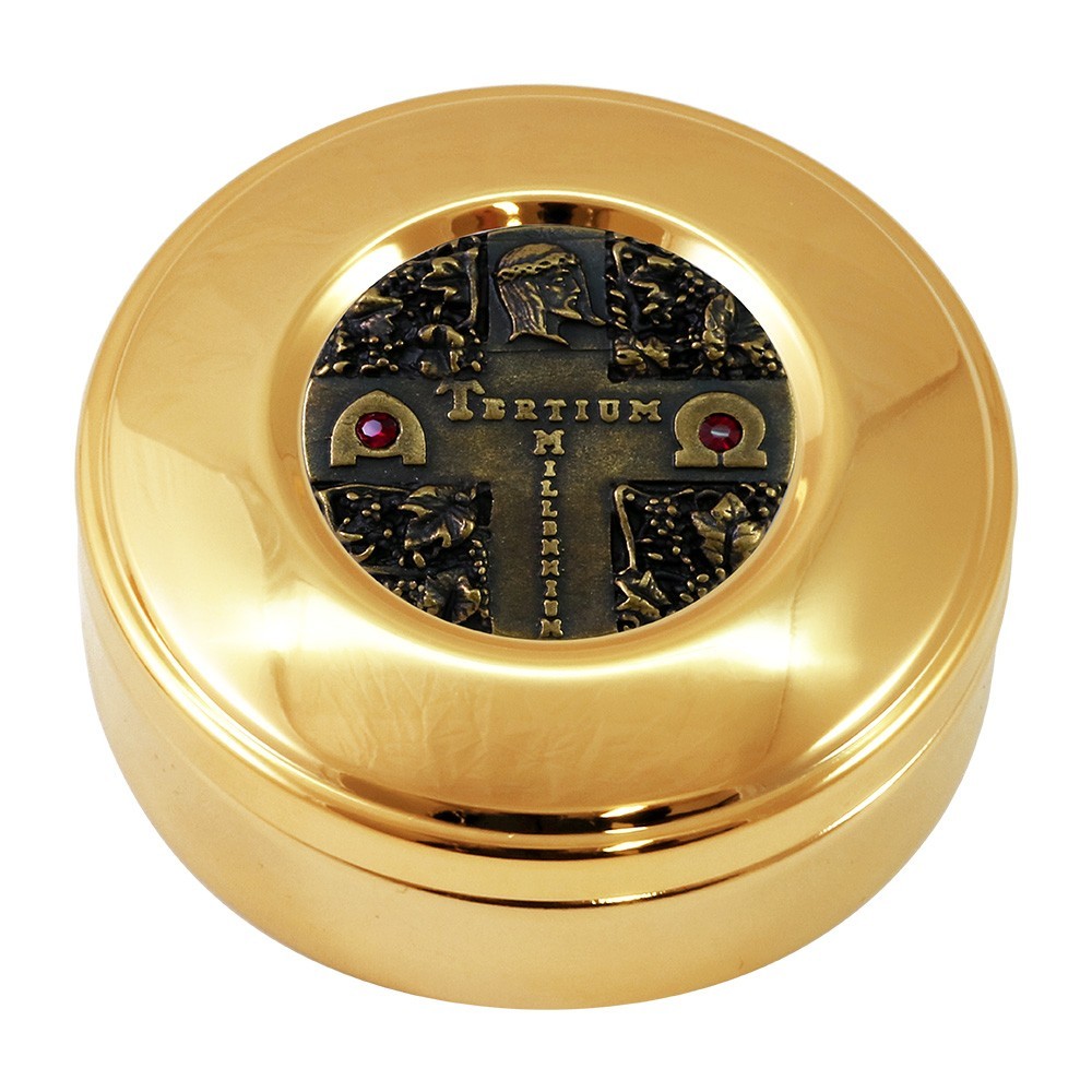 Questa capiente scatola per ostie si presenta in ottone dorata e con placca in rilievo "Tertium Millenium" con finitura ottone antico. Arricchita con pietre rosse. La teca è alta 2,5 cm e il diametro è 8,4 cm.