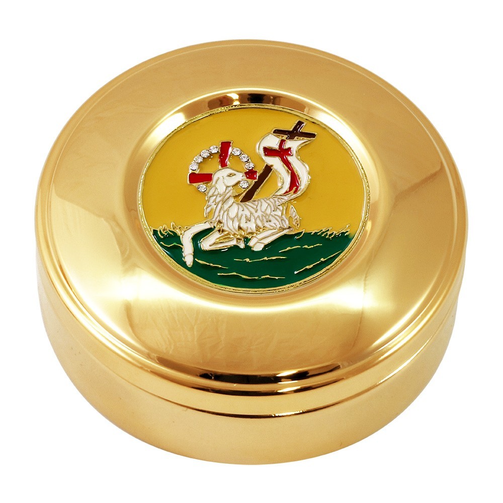 Scatola porta ostie con placchetta smaltata Agnello su sfondo blu.