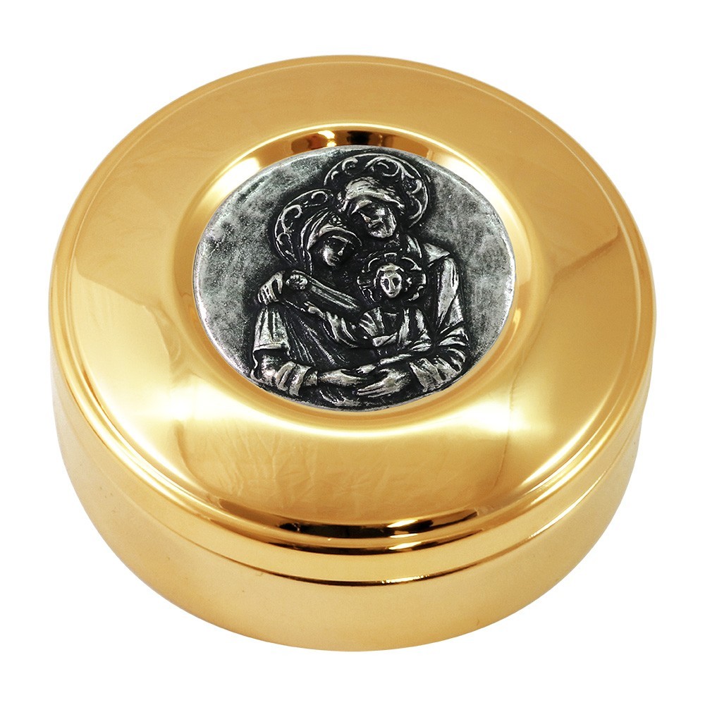 Scatola per particole in ottone con placca in rilievo Sacra Famiglia.
