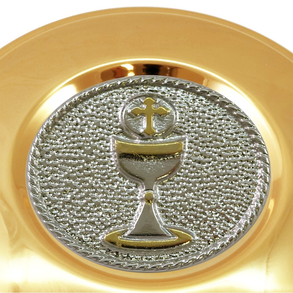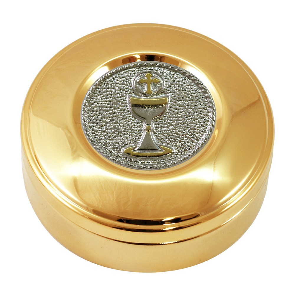 Scatola per ostie completa di placca in rilievo un calice con finitura oro e argento. La teca è rigorosamente in ottone dorato 24k.