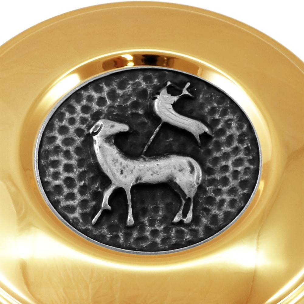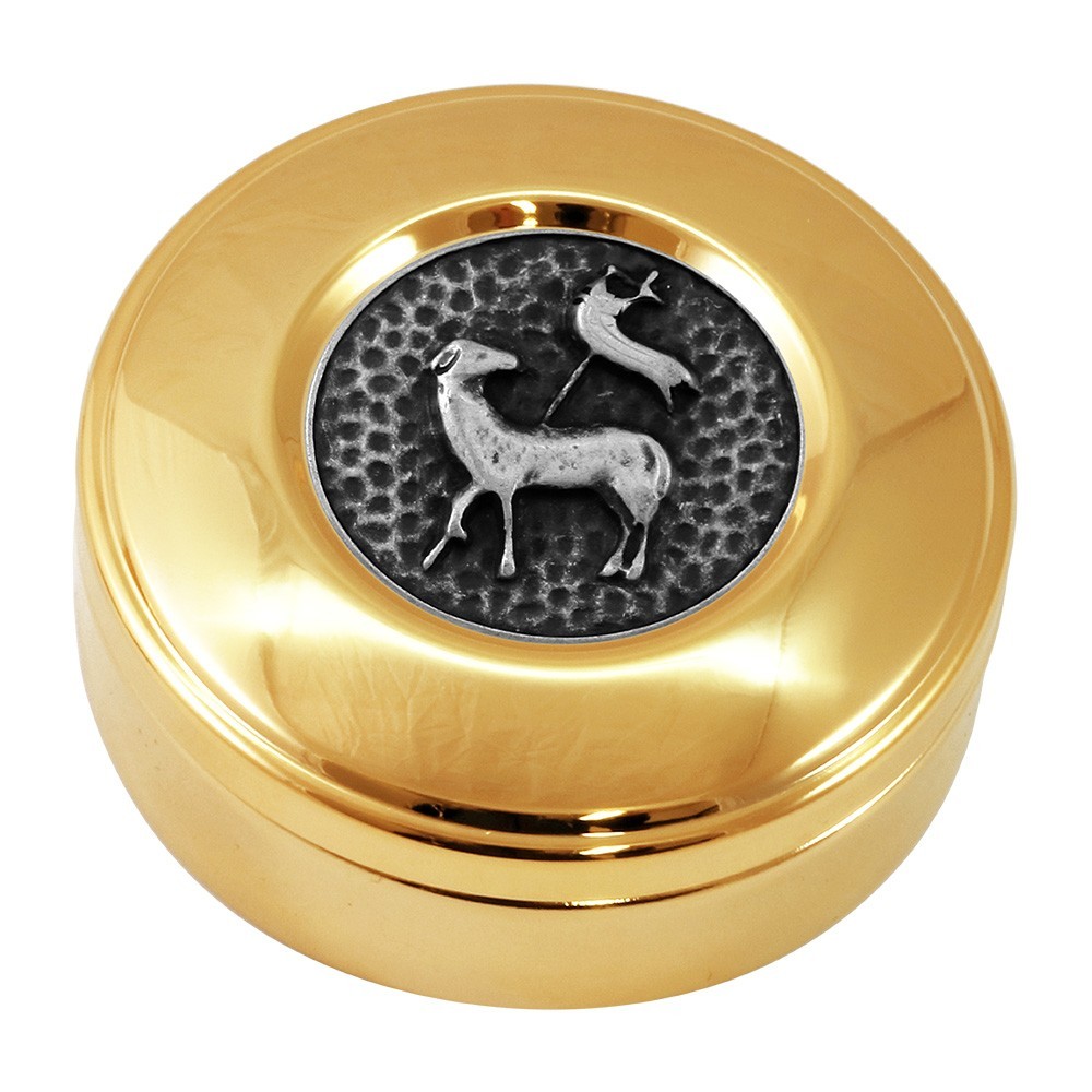 Scatola per particole in ottone dorato lucido con doratura 24 carati e placca in rilievo "Agnello" con finitura ottone antico. Prodotto Italiano.