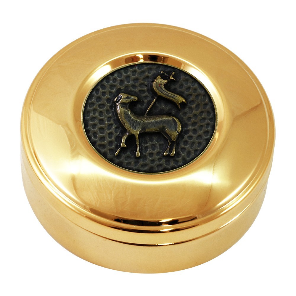 Scatola per particole in ottone dorato lucido con doratura 24 carati e placca in rilievo "Agnello" con finitura bronzo. Prodotto Italiano.