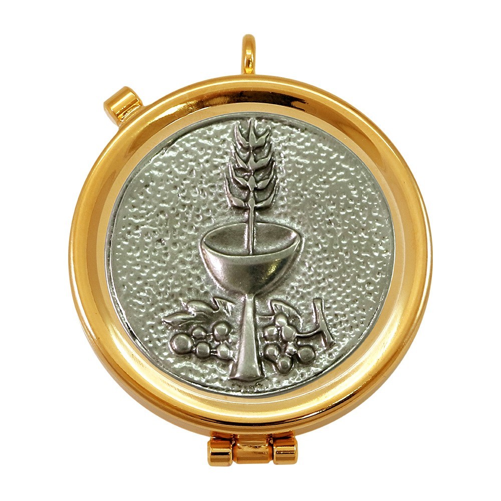 Teca porta ostie dorata con placca tono argento in rilievo. La teca è dotata di anello per appenderla al collo.