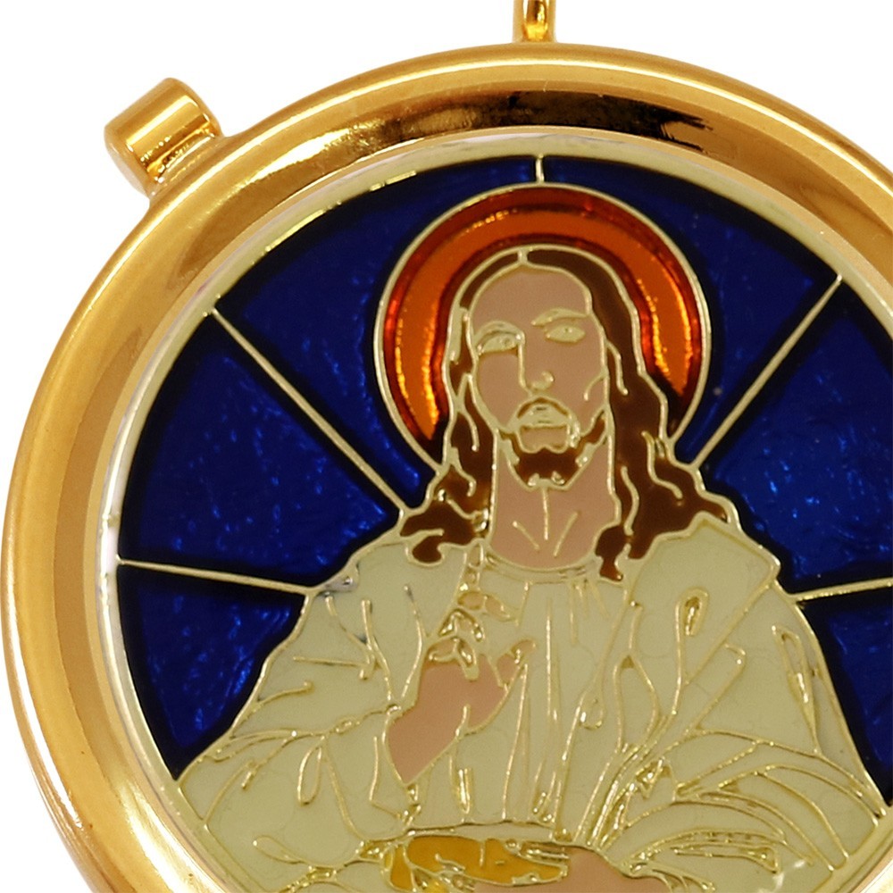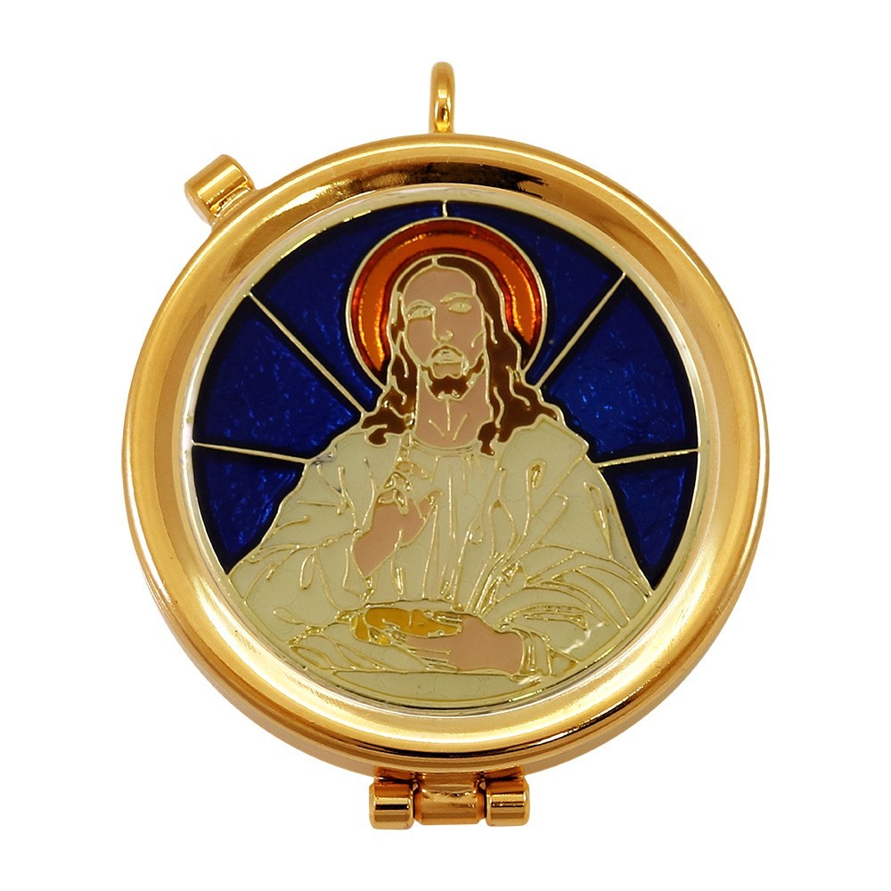Teca porta ostie con placca smaltata fondo blu e immagine di Gesù Cristo.