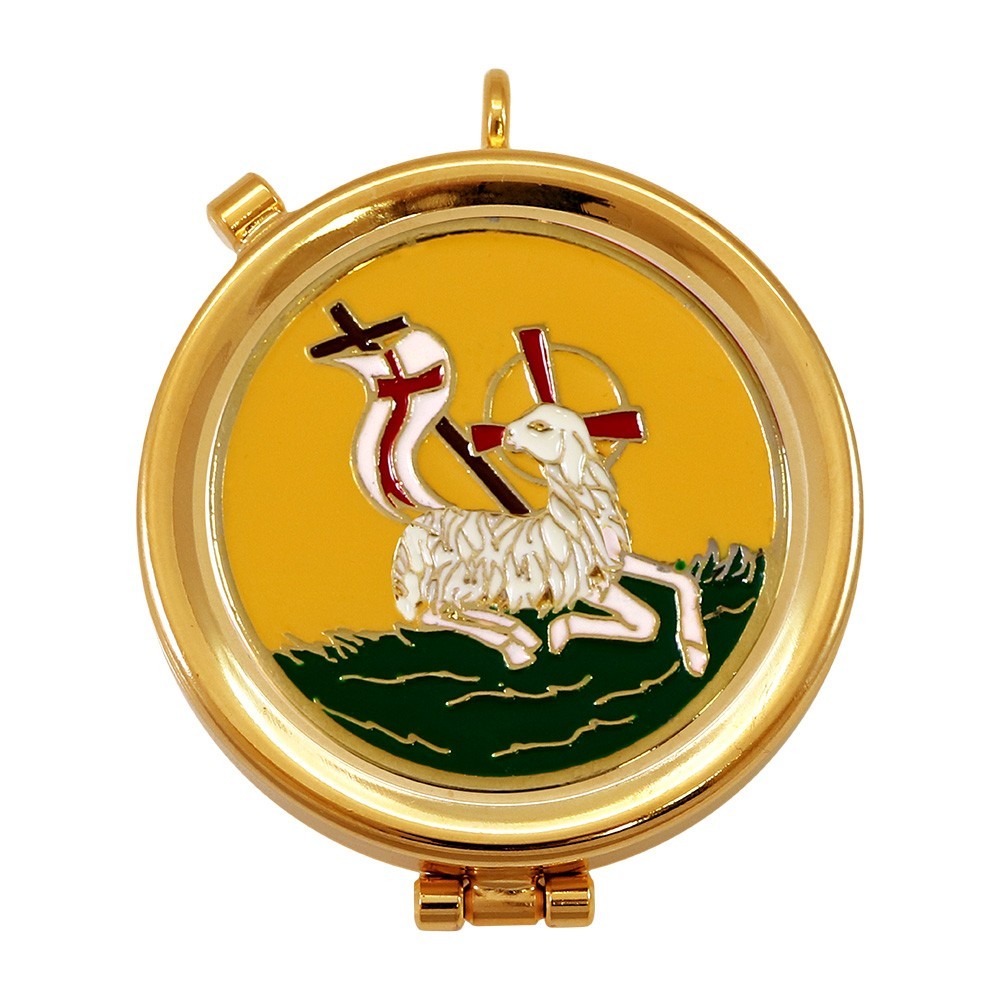 Teca porta ostie in ottone dorato con placca smaltata "Agnello della Pace". Completa di anello per poterla appendere al collo.