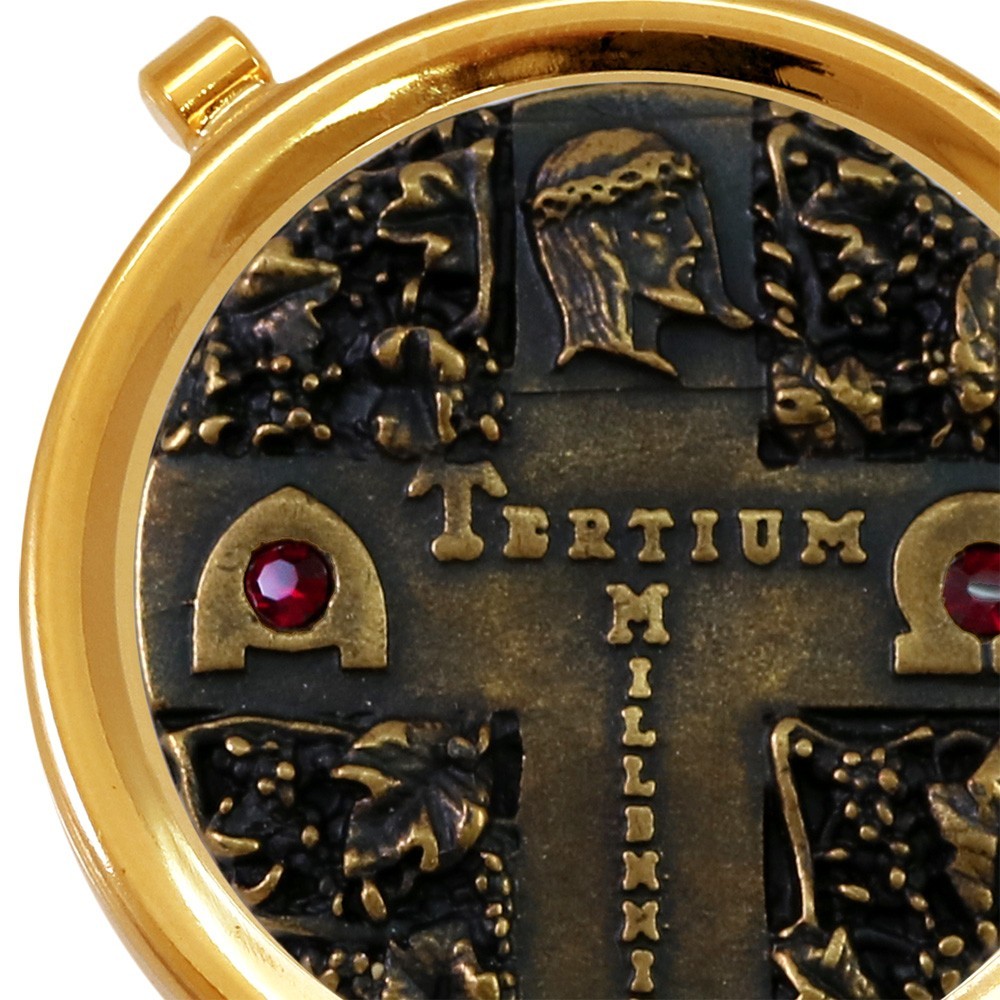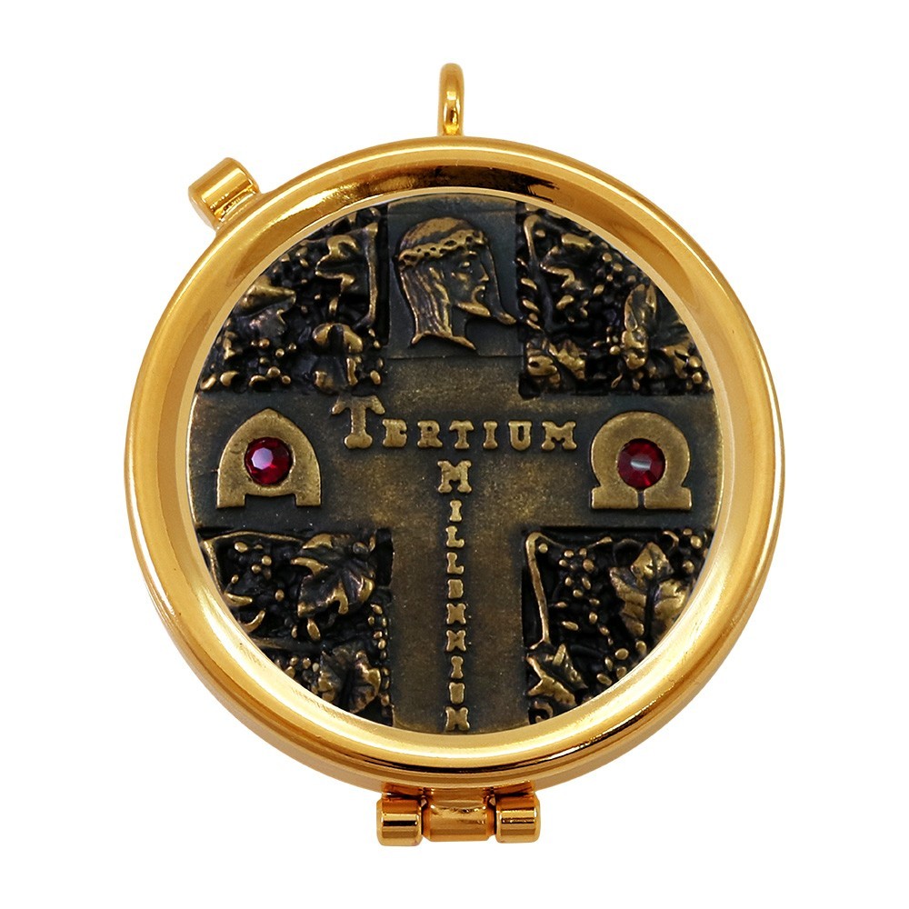 Teca per ostie realizzata in ottone dorata e placca in rilievo "Tertium Millenium" con finitura ottone antico. Arricchita con pietre rosse. La teca è alta 1,8 cm e il diametro è 5,3cm.