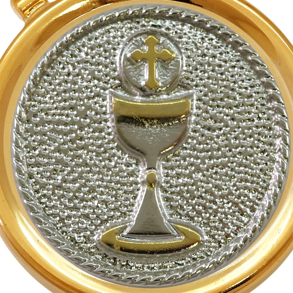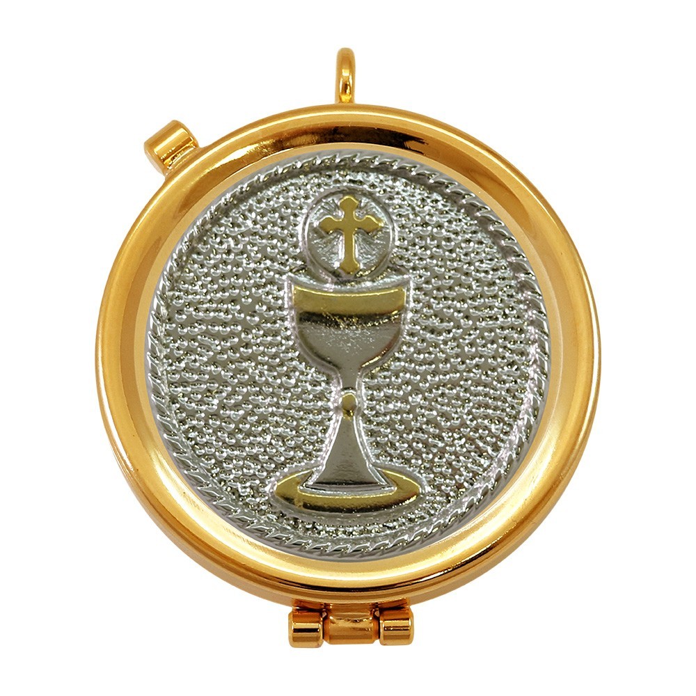 Teca porta ostie dorata con placca "Calice" in rilievo" tono argento e oro. La teca è dotata di anello per appenderla al collo.