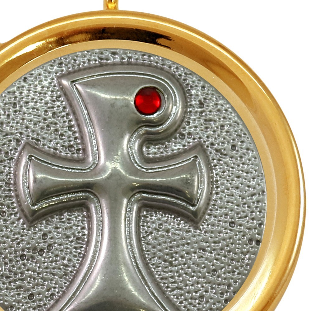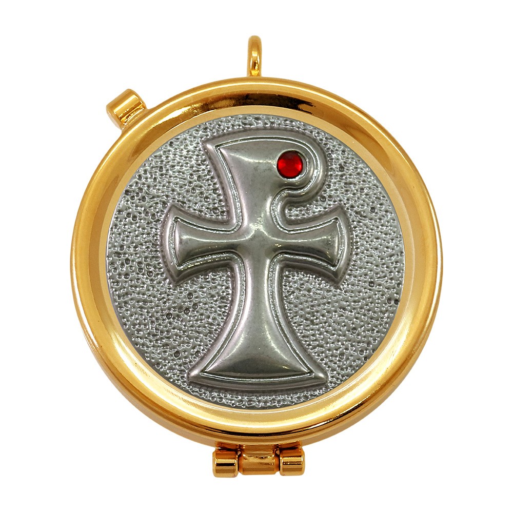 Teca porta ostie in ottone con placca a rilievo raffigurante la croce Tau arricchita con strass rossa.