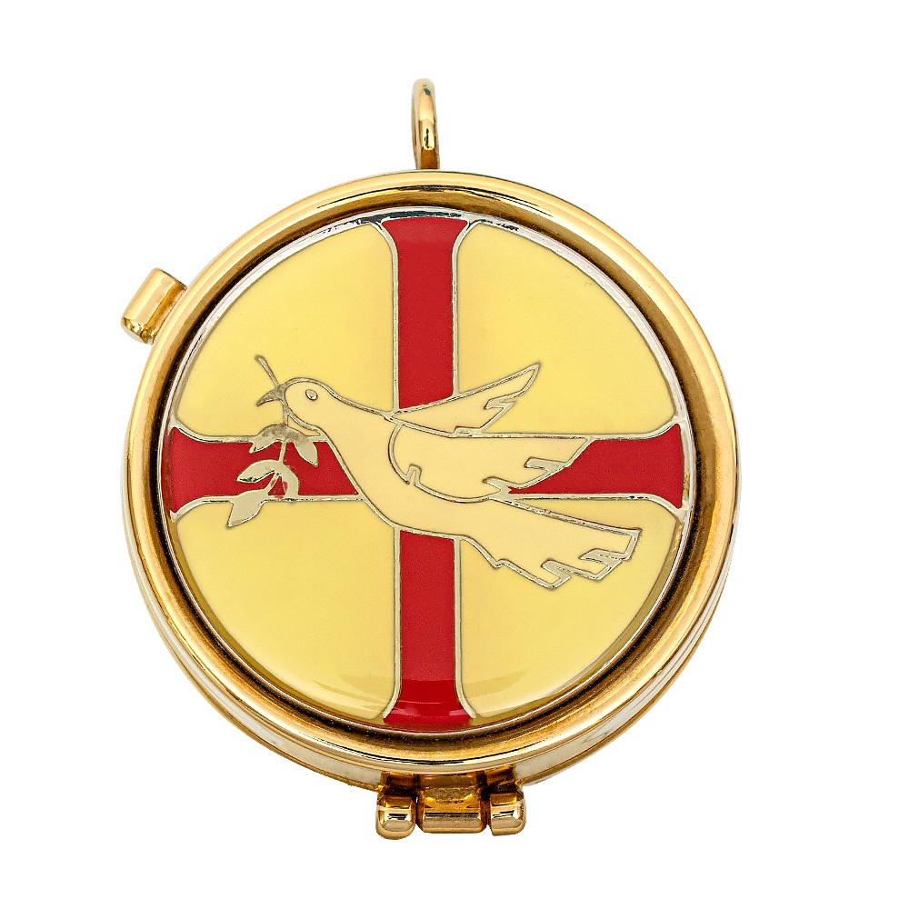 Porta teca eucaristica realizzata in ottone smaltato con decoro colomba in rilievo.