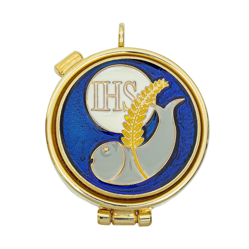 Consegna in 2 settimaneTeca eucaristica per ostie in ottone smaltata con decoro calice su fondo blu.