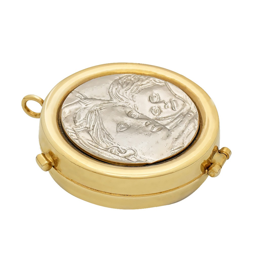 Teca porta ostie in ottone bicolore oro e argento. La placchetta è finemente decorata con finitura argento raffigurante una Madonna con Bambino.