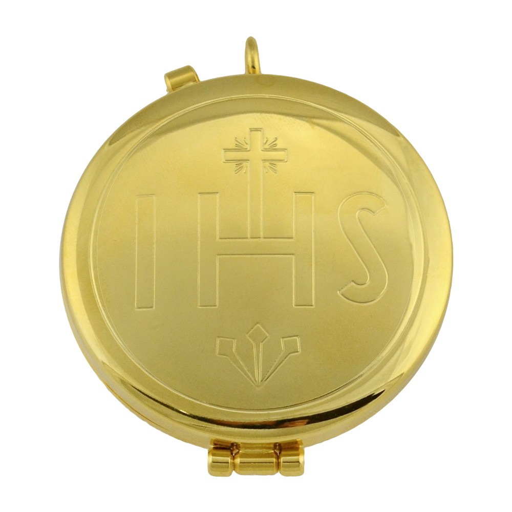 Teca porta ostie con scritta JHS. Realizzata in ottone dorato sia internamente che esternamente. Ideale per i Ministri straordinari dell'Eucaristia e per separare le ostie dei celiaci. Made in Italy. Può contenere massimo 10 particole.