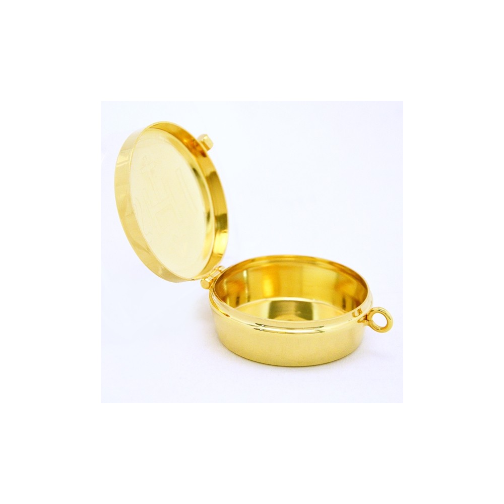 Teca porta ostie con scritta JHS. Ideale per sacerdoti e i ministri straordinari dell'Eucaristia che somministrano la Comunione ai malati, anziani e infermi. Ottima anche per separare le ostie dei celiaci. Made in Italy.