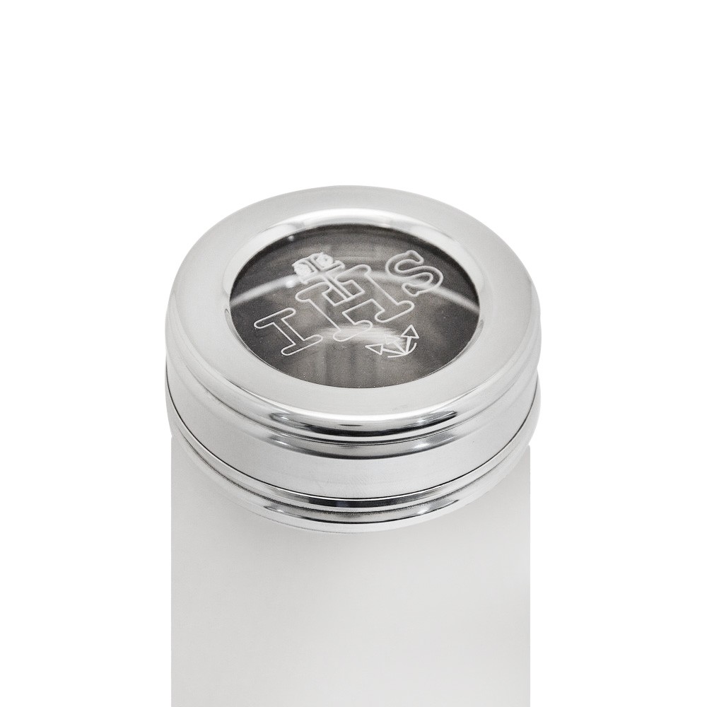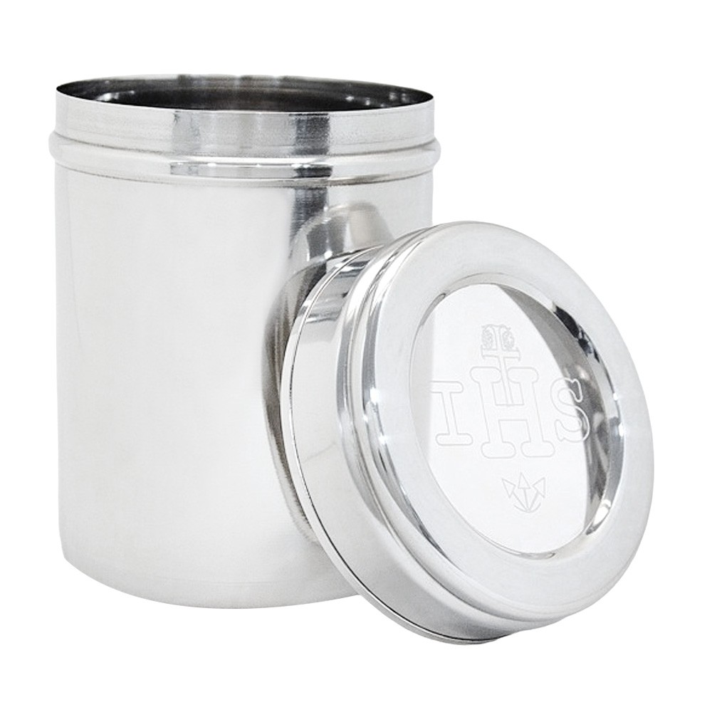 Scatola porta ostie da consacrazione. Questa teca ha il diametro di 10 cm e l'altezza di 12 cm. La parte superiore del coperchio in vetro con incisione JHS.