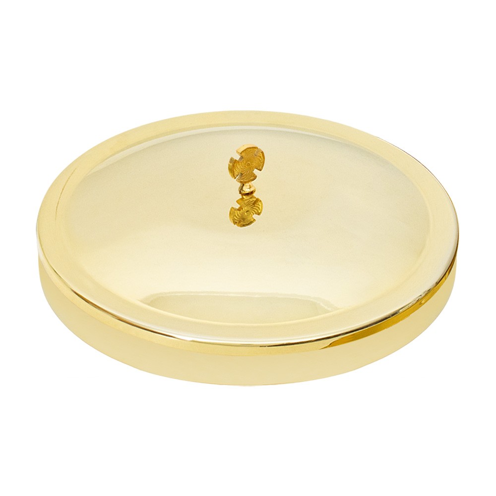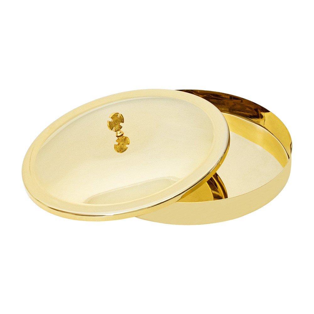 Teca porta ostia Magna realizzata in ottone dorato con coperchio e croce.