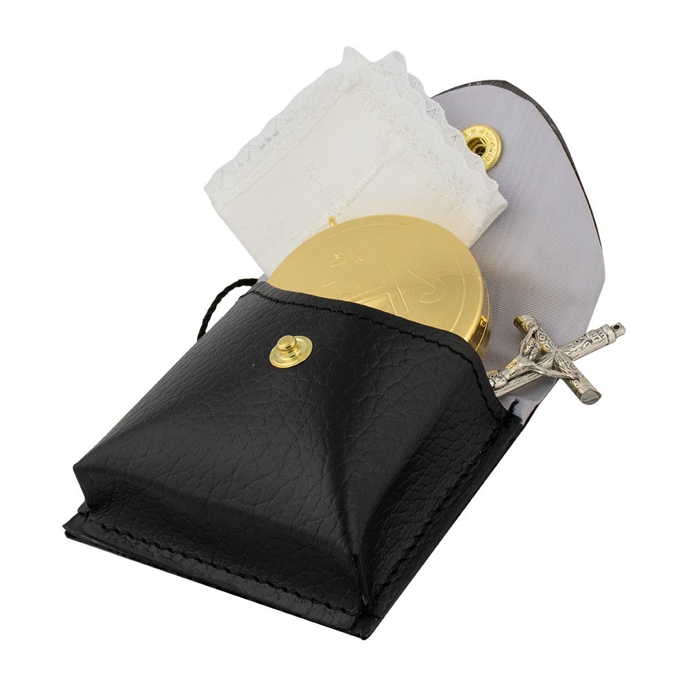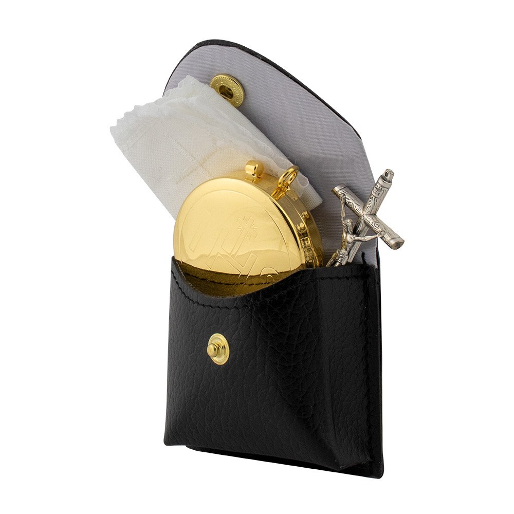Portateca in semil pelle, con croce in metallo, piccolo purificatorio e con cordino nero. Contiene teca con simbolo IHS.