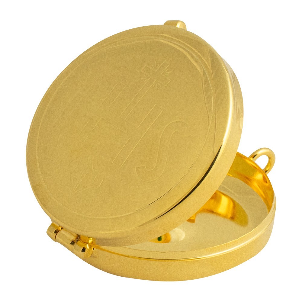 Consegna in 2 settimaneTeca per ostie in ottone dorato con incisione e pietra azzurra.