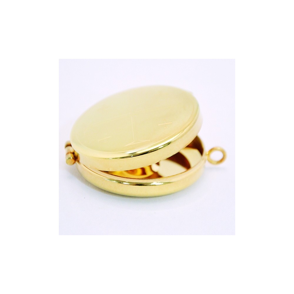 Custodia per ostie in ottone dorato incisa JHS, h 6,5 cm.