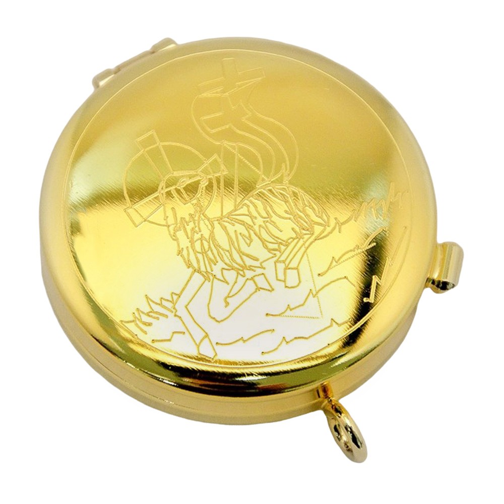 Mini teca eucaristica porta ostie in ottone con croce incisa e pietra colorata.