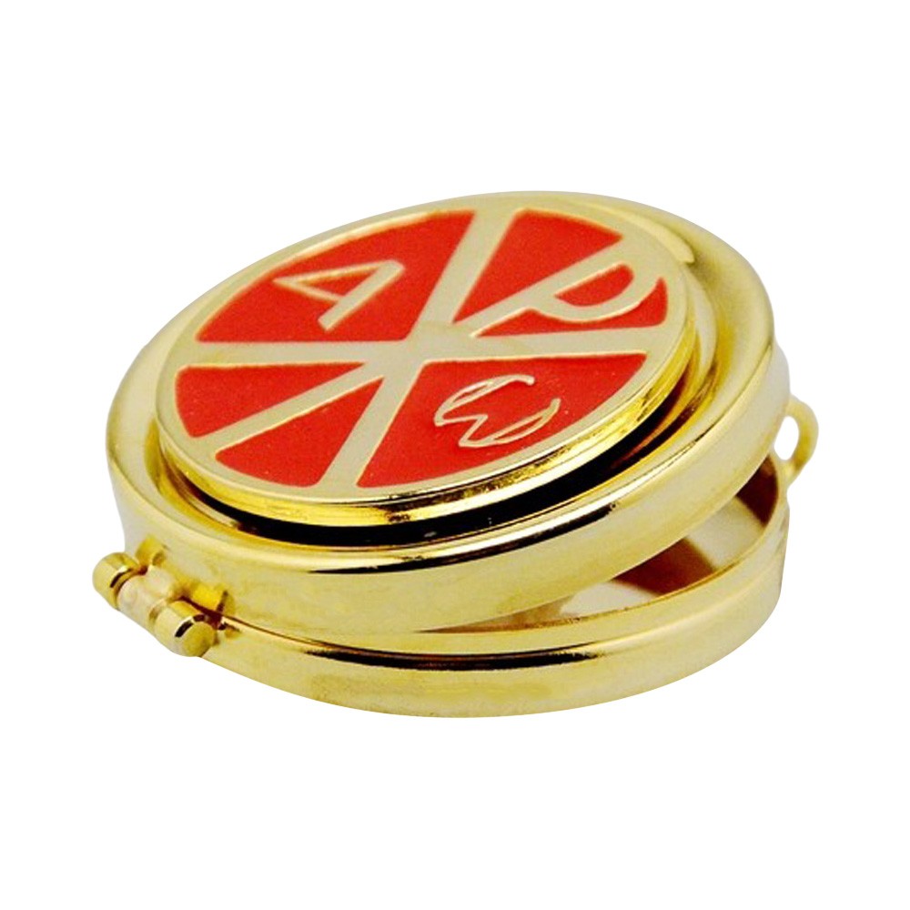 Teca eucaristica portaostie è realizzata in ottone dorato, smaltato e colorato sul coperchio. La teca raffigura i simboli eucaristici croce, Alfa e Omega. Made in Italy. Contiene circa 12 particole ed è alta 1, 8 cm e ha un diametro di 5, 3 cm. Completa di anello per appenderla al collo. Corredata di scatola trasparente in plastica.