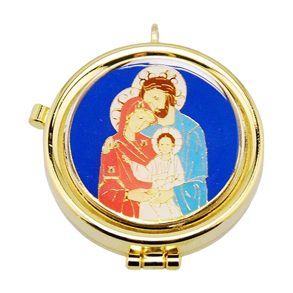 Teca per ostie in metallo dorato e con placca colorata e smaltata, raffigurante la sacra famiglia. Realizzata in Italia. Completa di anello per appenderla al collo.