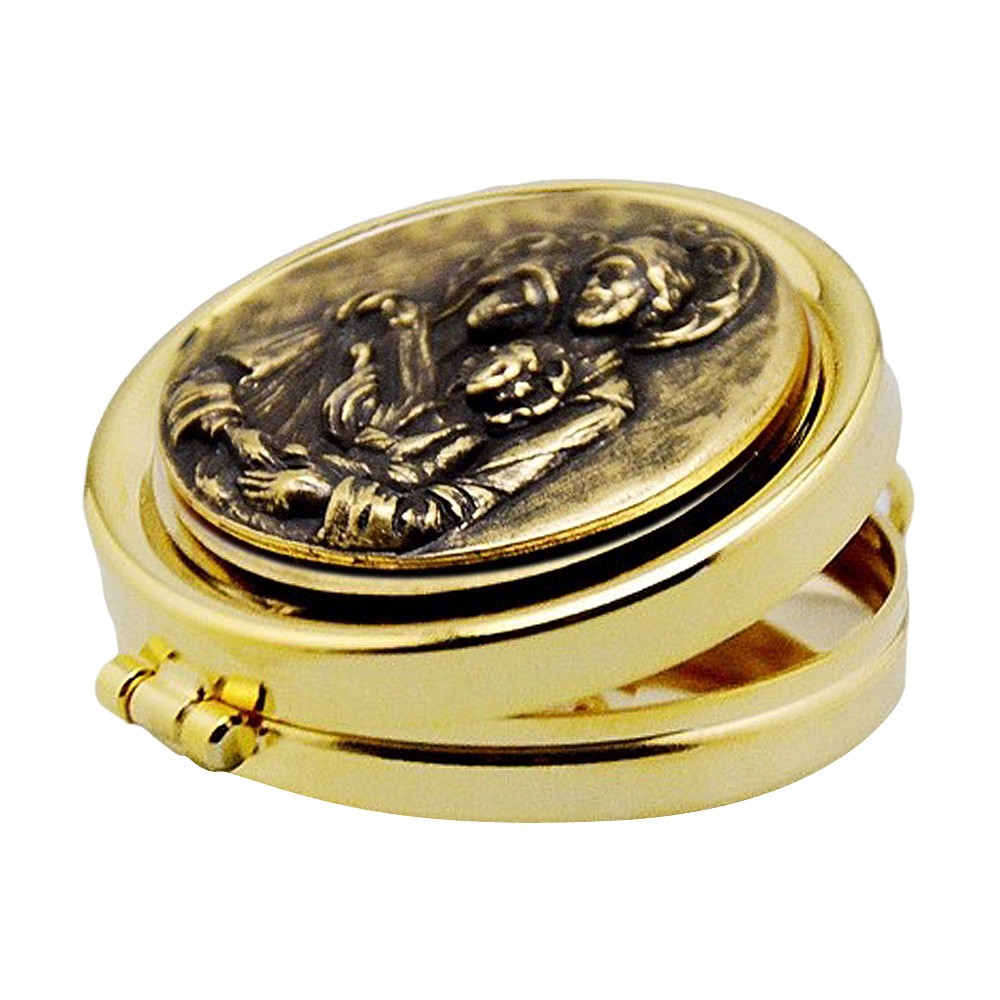 Consegna in 2 settimaneTeca porta ostie in ottone con Sacra Famiglia incisa su placca in bronzo.