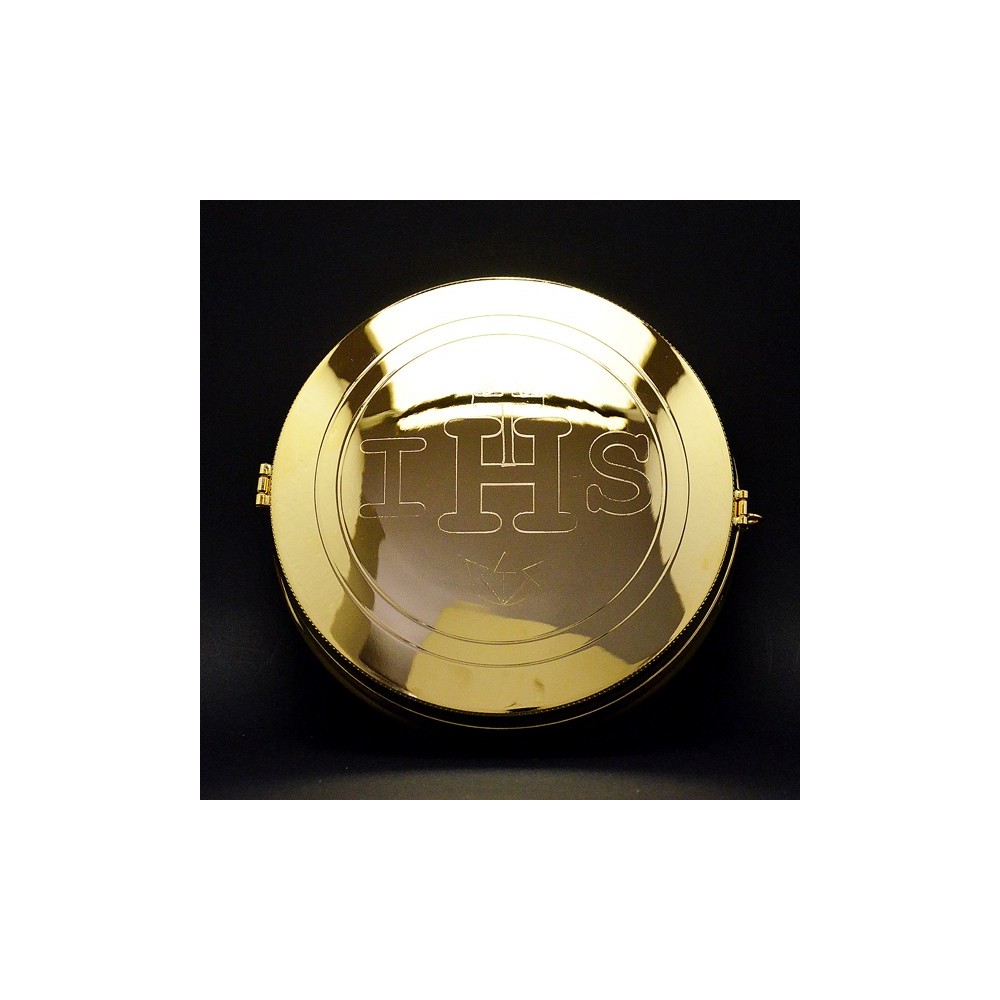 Teca porta ostia Magna realizzata in ottone dorato, con simbolo JHS. La teca ha il coperchio con chiusura a clips su un lato. Made in Italy.