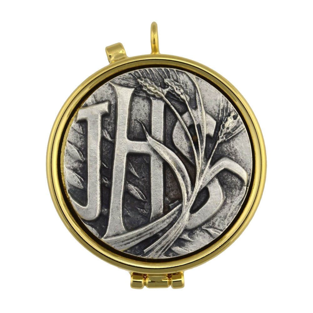 Teca Eucaristica in ottone dorato con placca in peltro raffigurante in rilievo la scritta JHS e grano. Realizzata in Italia. Contiene particole. Corredata di scatola trasparente in plastica.