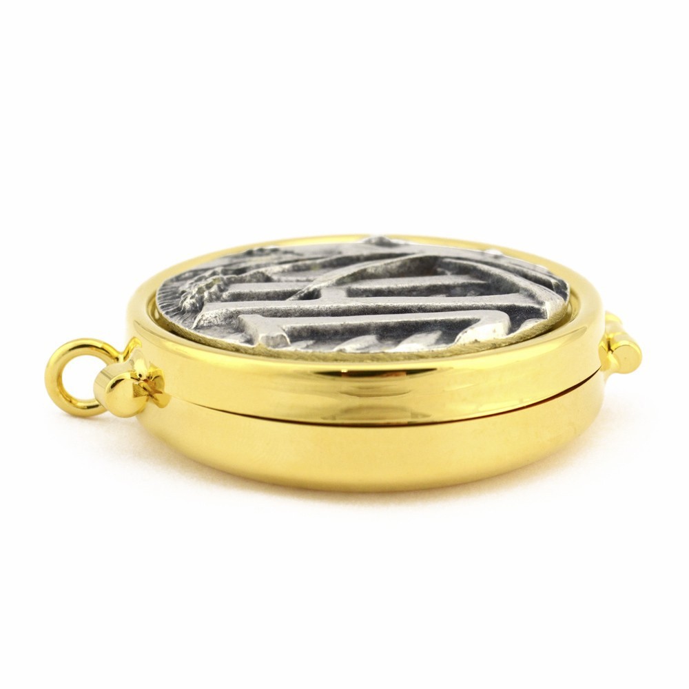 Porta ostie in ottone con placca in argento antico, Ø 5.3 cm.