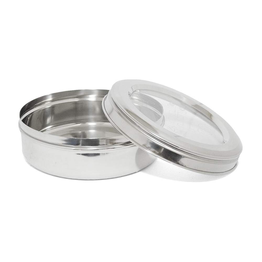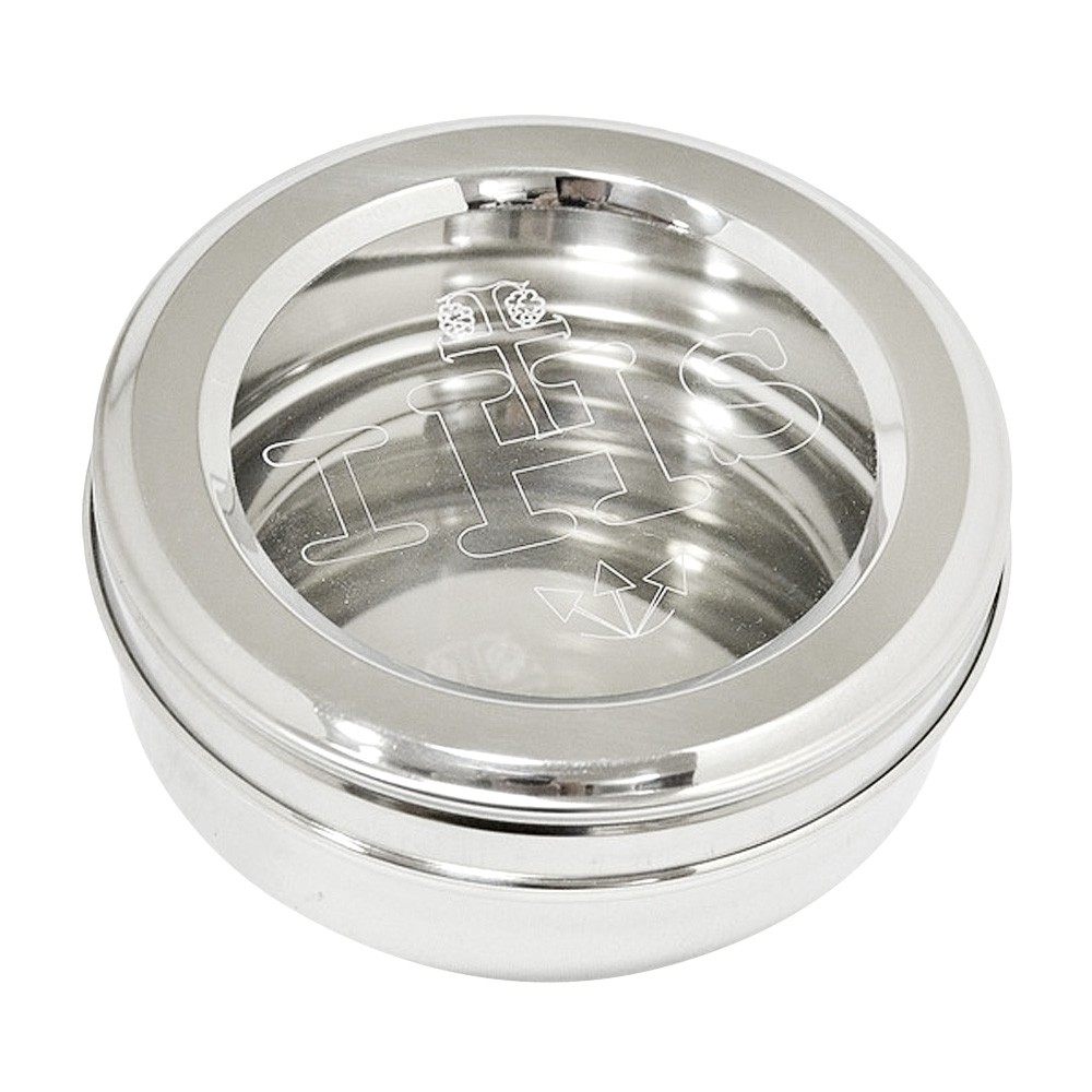 Scatola porta ostie magna in acciaio inox con chiusura ermetica e coperchio trasparente, può contenere circa 50 ostie magna o 1000 particole.