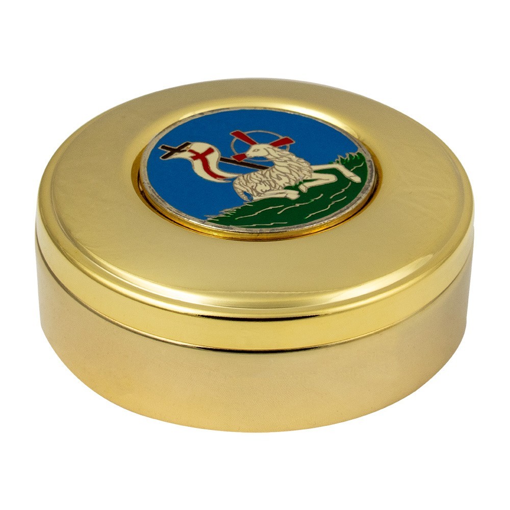 Teca porta ostie con placca smaltata "Agnello della pace".