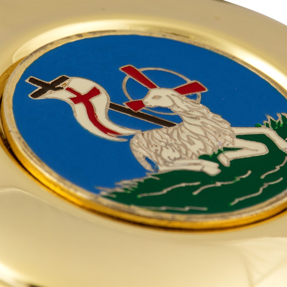 Teca eucaristica realizzata in ottone dorato lucido con placca smaltata colorata raffigurante "l'Agnello della Pace".