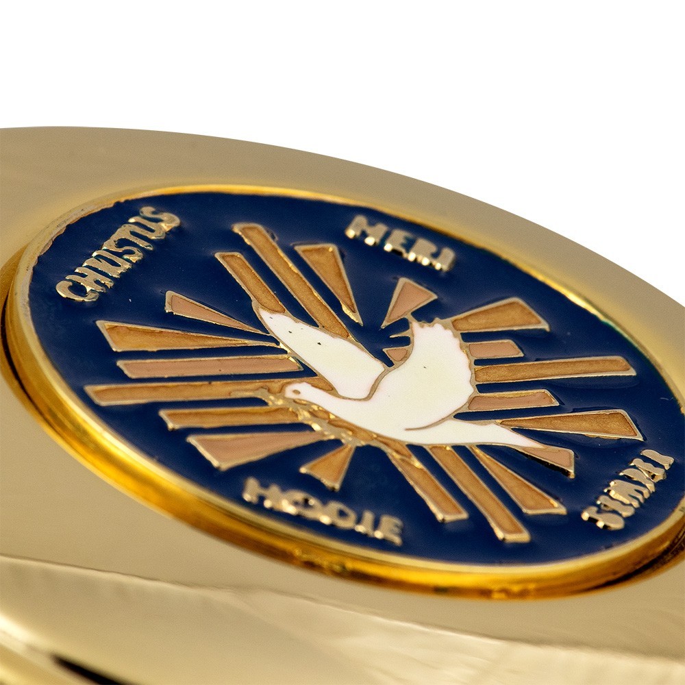 Teca porta ostie realizzata in ottone dorato lucido con placca smaltata. La placca smaltata sul coperchio si presenta con colori intensi e raffigura una Colomba con un ramoscello d'ulivo e scritte in latino " Christus heri, hodie semper "